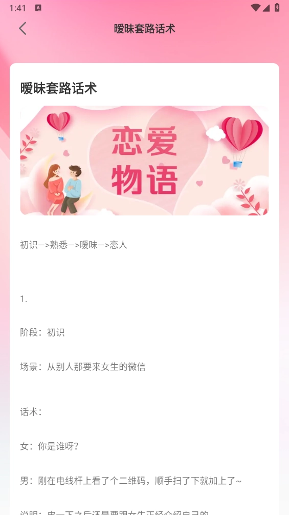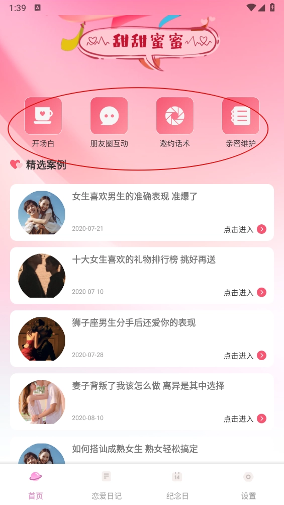 打开软件后,首页包含开场白、朋友圈互动、邀约话术以及多个精选案例等内容。