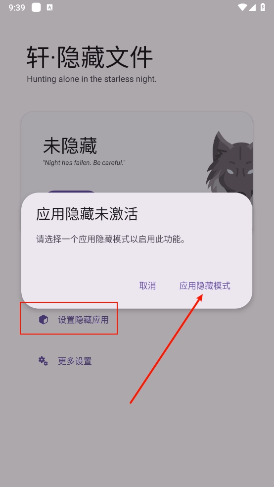 点击“设置隐藏应用”后,该功能需激活方可使用,激活后点击“应用隐藏模式”即可启用。