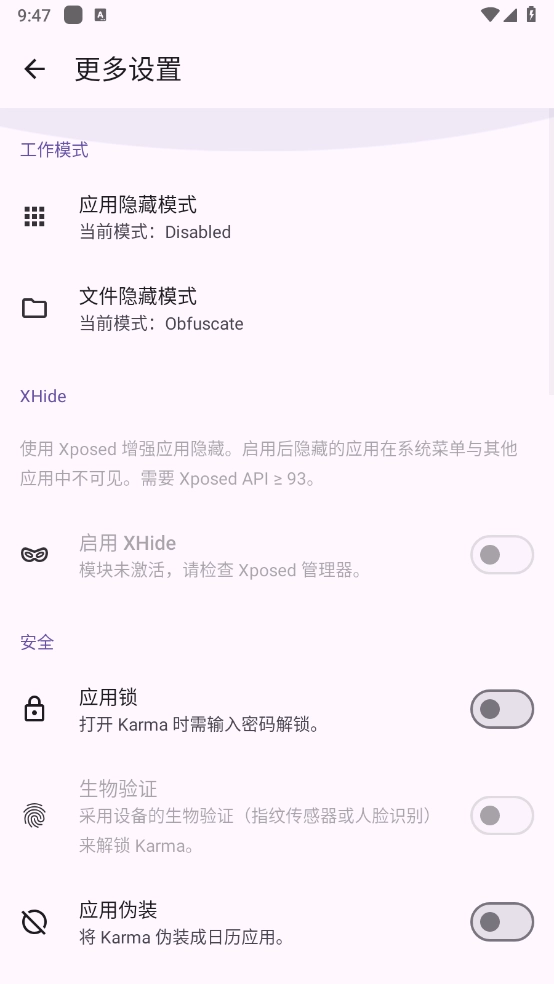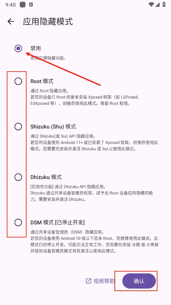 进入后,系统默认处于禁用状态,你可以从多个模式中任意选择一个启用,点击“确认”后,最后上传需要隐藏的应用即可。