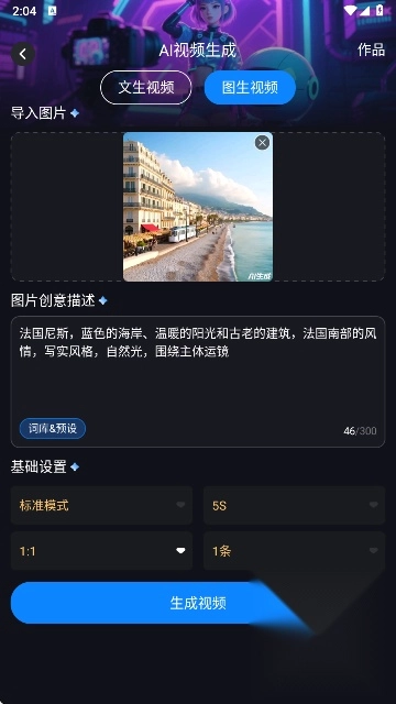 4、先导入图片,接着输入描述文字并完成基础设置,最后点击【生成视频】按钮就可以了。