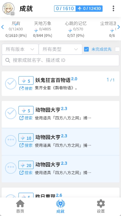 椰羊cocogoat是一款专为原神玩家开发的游戏成就管理工具,能帮助我们清楚掌握各类成就的达成方法。它覆盖的游戏版本十分齐全,从最早的1.0版本到最新的6.0版本,相关内容在椰羊cocogoat里都能找到。为了让我们更顺利地完成各项成就,椰羊cocogoat还详细说明了成就的完成步骤,这样我们就能快速达成目标并领取原石奖励。另外,在完成成就后,我们可以回到软件中进行标记,避免重复去做已经完成的成就。