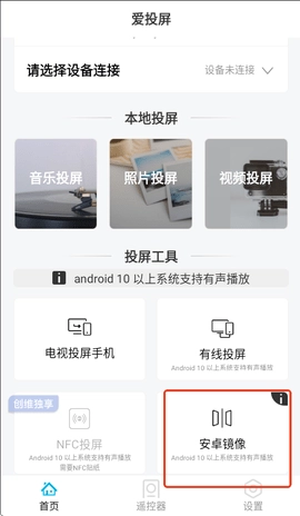 打开爱投屏手机端后,首先需要连接电视,接着点击“请选择设备连接”选项。