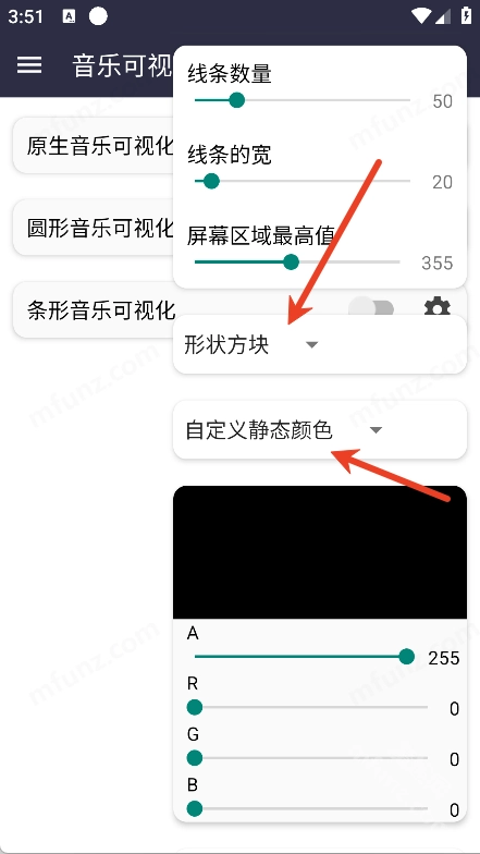 音乐可视化安卓版界面简洁,使用方法也相当简单,它相当于一个在音乐播放器软件当中的小插件,根据你自己的喜好选择音乐可视化模式,每种模式 都能自定义设置变化的速度、大小以及显示的屏幕区域,打造更加个性化的音乐播放体验!