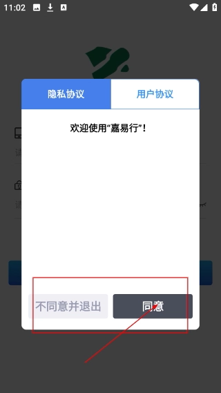1、进入【嘉易行】界面后,仔细阅读【隐私协议】与【用户协议】,在确认条款内容无误后点击【同意】按钮,完成协议确认流程,以便继续进行后续操作。