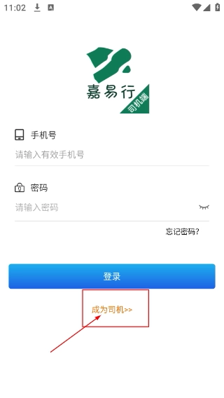 2、在【嘉易行】的登录页面,需要填写【手机号-请输入有效的手机号码】和【密码-请输入密码】这两项信息;此外,也可以点击【成为司机>>】按钮,进入司机注册的相关流程。