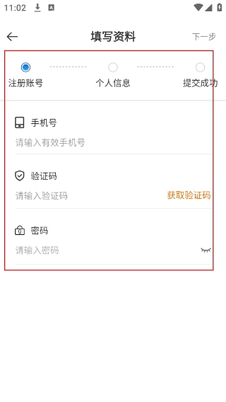 3、进入【填写资料-注册账号】环节后,先填写【手机号】,接着点击【获取验证码】,然后设置【密码-请输入密码】。