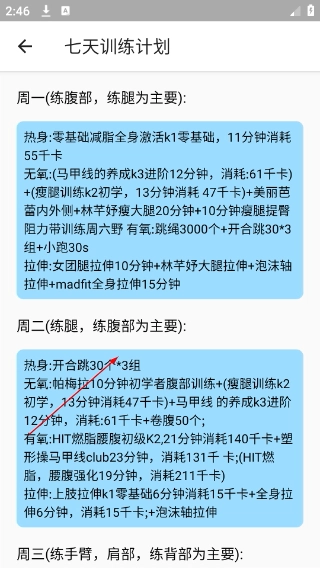 3、进入【七天训练计划】页面后,可查看每日训练安排,例如【周一-主要练腹部和腿部】等,这些安排包含了热身、无氧、有氧以及拉伸等各个训练环节。