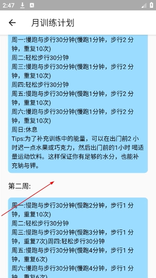 4、进入【月训练计划】页面,查看每周慢跑与步行的训练安排,同时结合训练前的能量补给建议来调整身体状态。