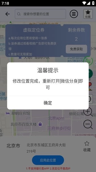 最后会出现“修改位置完成,重新打开[微信分身]即可”的提示,点击“确定”按钮。
