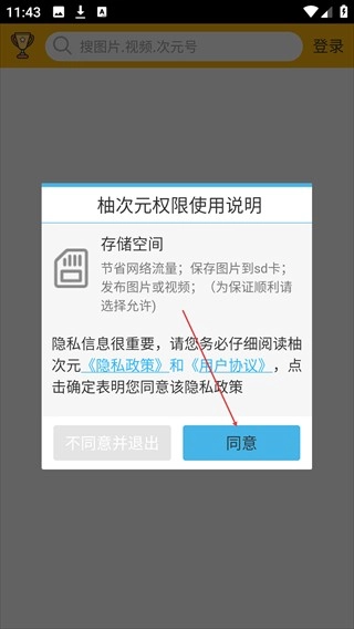 1、应用启动后会弹出“柚次元权限使用说明”窗口,点击【同意】按钮,即可进入应用首页。