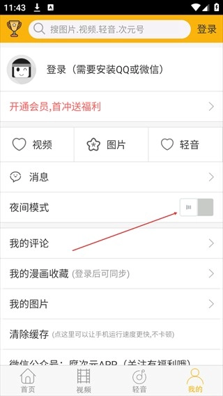3、进入个人中心页面后,找到“夜间模式”这一选项,点击它右侧的开关按钮,就能开启夜间模式了。