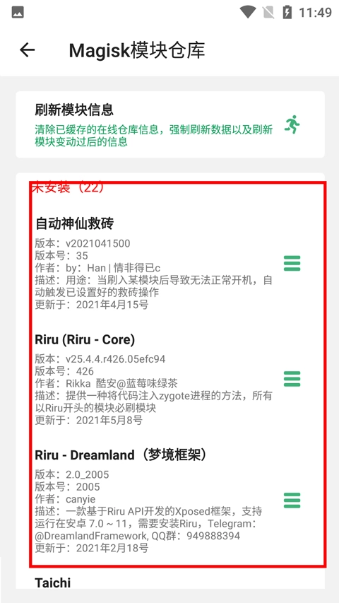2、进入magisk模板仓库后,这里有众多功能框架,你可以挑选自己需要的。