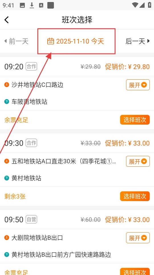 2、在班次选择界面点击日期区域,就能进入日期选择界面,调整乘车日期了。