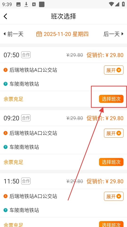 4、选定日期后,在班次列表里点击【选择班次】按钮,就能确定要乘坐的班次了。