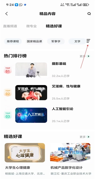 打开软件后,进入精选好课页面,映入眼帘的是热门排行榜和各类课程分类,接着找到分类切换按钮,准备从中挑选合适的课程类别。