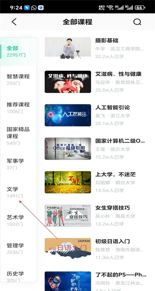 进入全部课程页面后,左侧会显示包含全部智慧课程在内的各类分类列表,选择文学分类后,右侧便会呈现该类别下的多门课程供用户挑选。