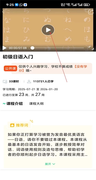 进入初级日语入门课程的详情页面后,查看课程时长、学习周期等相关信息,接着找到页面上的播放按钮,点击它就能开始学习这门课程的内容了。