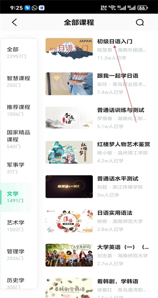 在文学分类的所有课程页面中,浏览呈现的课程列表,找到初级日语入门课程,打算进入该课程的详情页面。