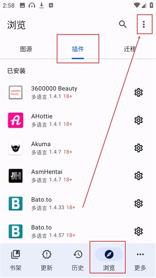 1、在浏览页切换至【插件】标签,即可查看已安装的插件列表,点击右上角的三点图标,就能打开更多与插件相关的操作选项。