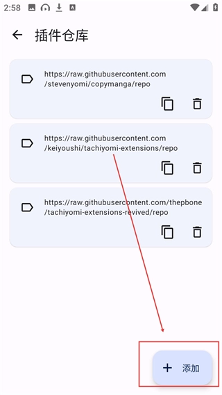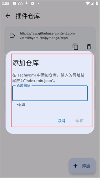 4、在【添加仓库】弹窗的输入框中填写符合要求的网址,确认无误后点击【添加】按钮,即可成功新增插件源。