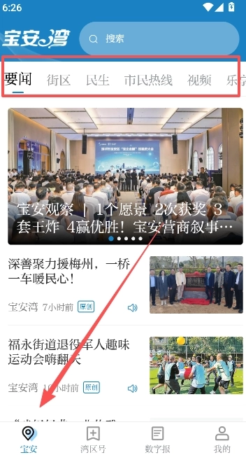 这款软件主要包含宝安、湾区号、数字号和我的四个板块,其中首页的宝安板块展示的内容,大多是每日最新资讯,均由宝安本地推送,实时热点话题新闻在这里都能找到。