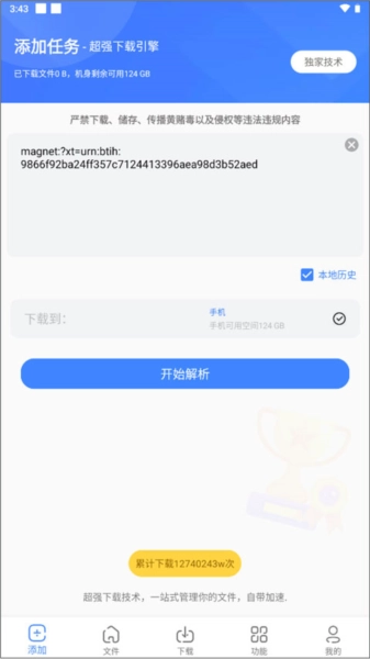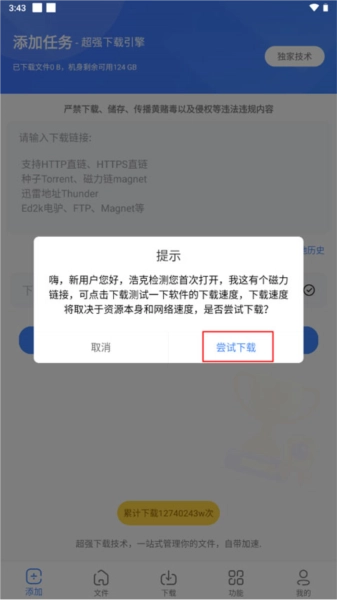 1、打开后会出现一个用于测试的磁力链接,你可以点击右下角的“尝试”按钮来进行测试。