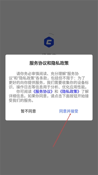 启动应用后,会弹出【服务协议与隐私政策】的弹窗,仔细阅读相关条款后,点击【同意并接受】按钮,即可进入登录页面。