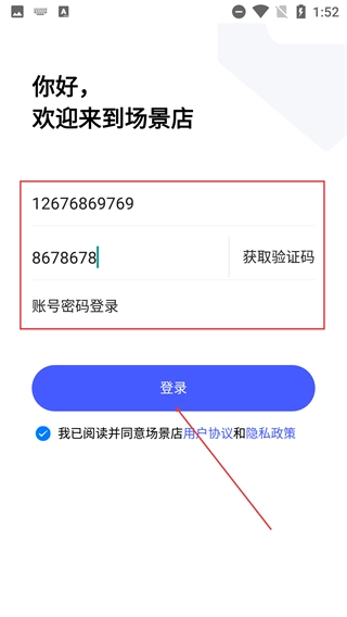 在“场景店”登录页面,选择【短信登录】的方式,就能切换到手机号加验证码的登录界面。