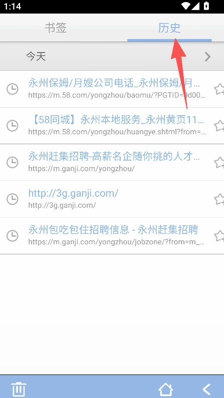 2、进入书签 / 历史页面、查看过往浏览记录。