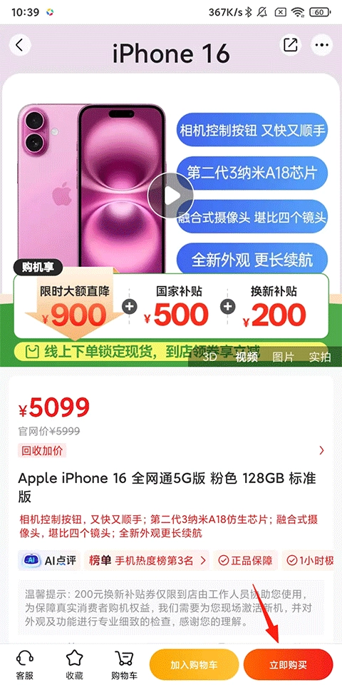 打开九机网,挑选想要分期购买的手机,然后点击【立即购买】按钮。