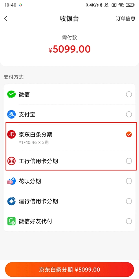 进入支付页面后,平台提供了【京东白条分期】与【工行信用卡分期】两种选项,您可依据自身需求进行挑选。