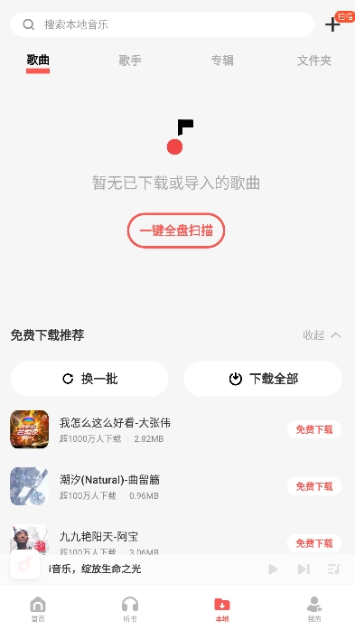 在本地中设有一键扫描功能,能快速帮你导入本地歌曲,此外还有不少免费歌曲可供使用。