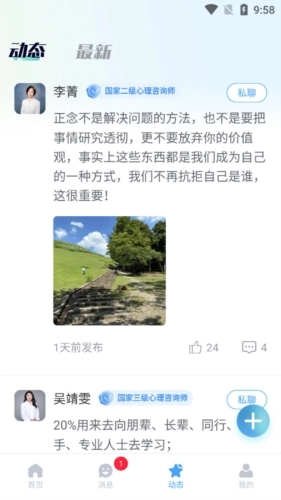 在动态页面,你能浏览到其他心理咨询师分享的各类帖子。