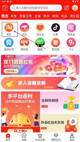 1、点击页面内的【淘宝】入口,即可跳转至关联的购物聚合页面,在该页面能够查看来自多个平台的优惠信息、活动动态等相关内容。