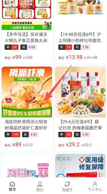 设置优选、爆款、热销、线报等商品类别,呈现各类优惠商品,并标注券后价格以及相应的返现金额。