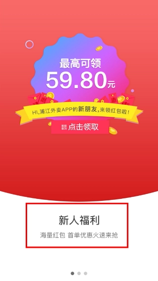 1、这是浙江外卖的新人引导页面,在这里可以领取最高59.80元的新人红包,还能参与“新人福利”板块里的海星红包、首单优惠等各类活动。