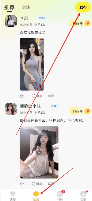 用户进入软件后,直接在动态页面右上角点击“发布”按钮即可完成操作。