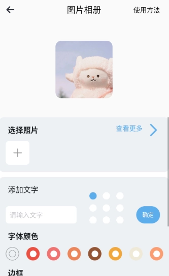 4、选择照片、添加文字、字体颜色和边框后下滑。