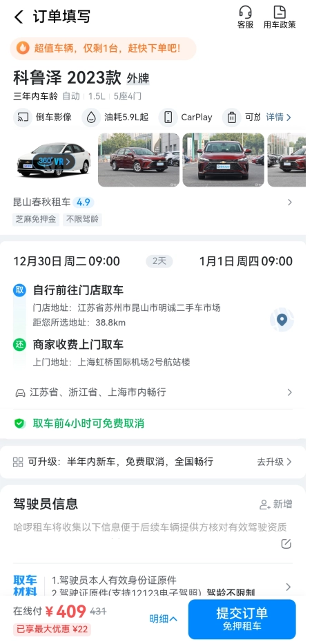 3、填写驾驶员相关信息,同时确认订单取车还车的时间、取还方式等关键内容。确认无误后,即可直接提交订单,完成整个预订流程。