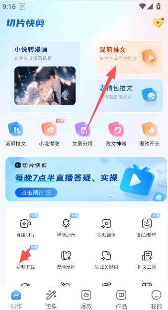 AI一键生成推文视频:支持把小说文案智能转变成漫画风格视频或者动态混剪视频,有多种画面模型和配音可供选择,能快速完成视觉化创作。