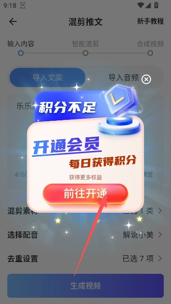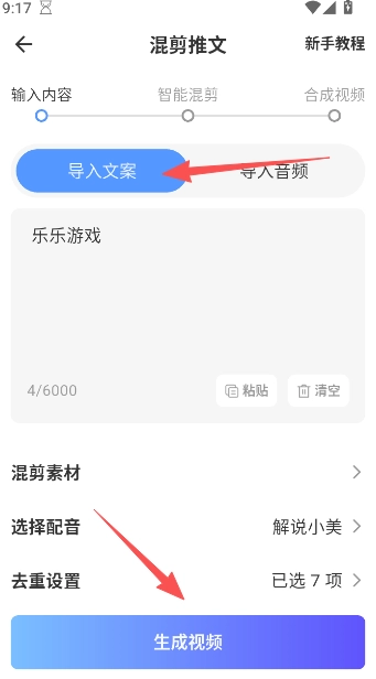 在文案内容区域填写文字,勾选混剪素材、配音等必要的素材选项后,点击生成视频按钮。