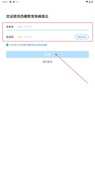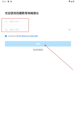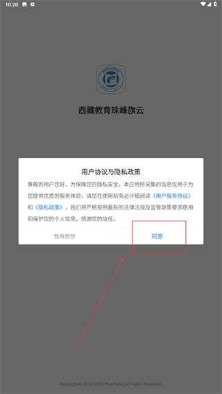 在【西藏教育珠峰旗云】的用户协议页面,仔细阅读《用户服务协议》与《隐私政策》的内容后,点击【同意】按钮即可进入登录环节。