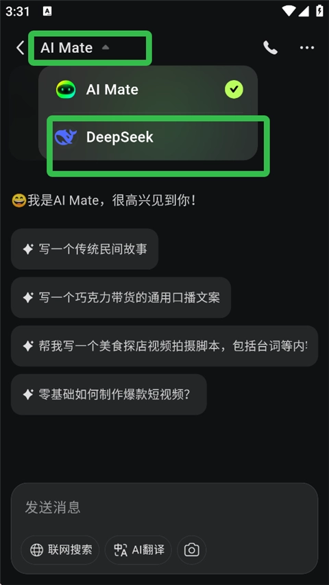 2、点击【AI Mate】旁边的下拉图标,切换至deepseek模型即可。