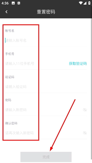4、进入重置密码界面后,依次填写账号名、手机号,获取并填入验证码,设置新密码与确认密码,全部完成后点击“完成”按钮,即可完成密码重置操作。