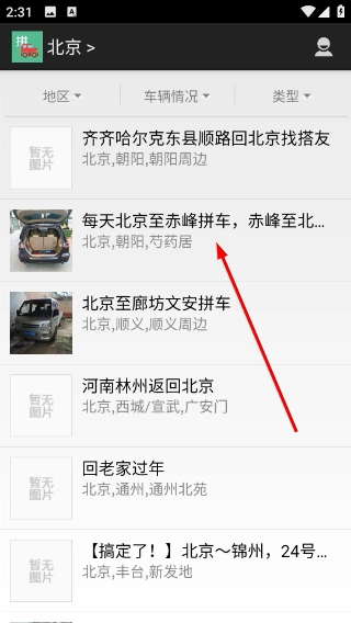 3、在城市(北京)的拼车列表中,可查看各类拼车信息(如“每天北京至赤峰拼车”),点击对应条目,即可进入该拼车信息的详情页。
