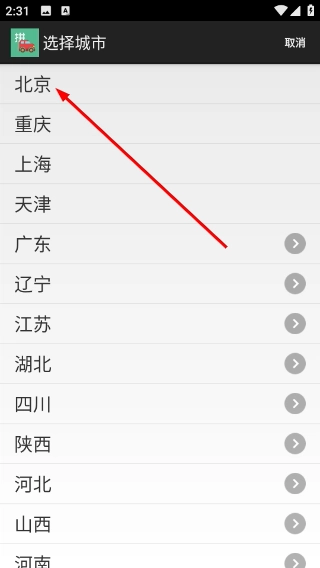 2、进入城市选择界面后,可选择目标城市(如“北京”),选定后即可进入该城市的拼车信息列表页面。