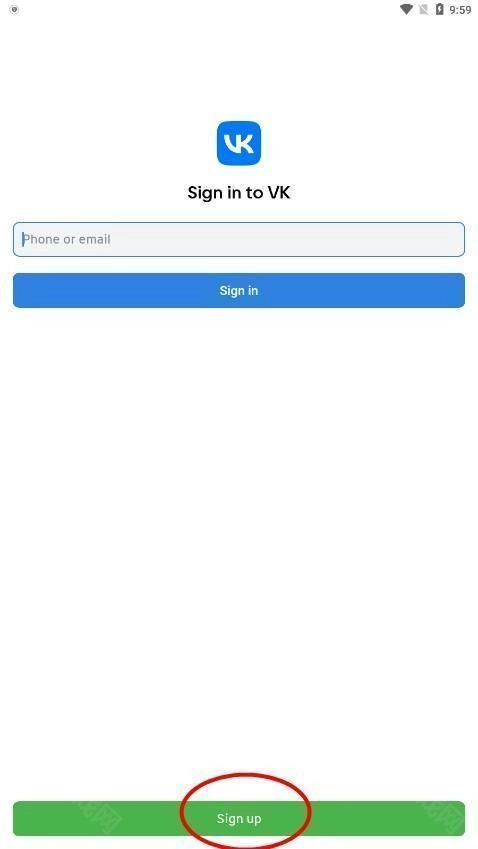 打开VK,进入登录界面后,点击页面下方的“Sign up”选项。