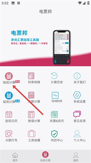 在电票邦首页,找到并点击【贴现计算专业】选项,即可进入承兑汇票的专业贴现计算页面。