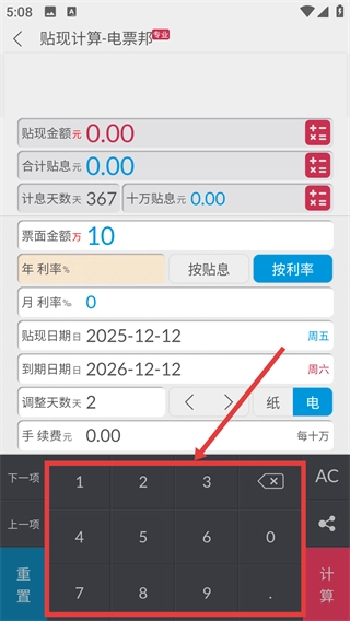 在贴现计算页面,借助数字键盘输入票面金额、年利率等必要的计算参数,以补充完整贴现相关信息。