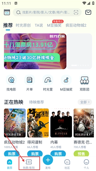 在电影软件的首页,点击底部的【购票/影院】选项,就能进入购票页面,在那里可以查看正在热映的影片以及对应的购票入口。